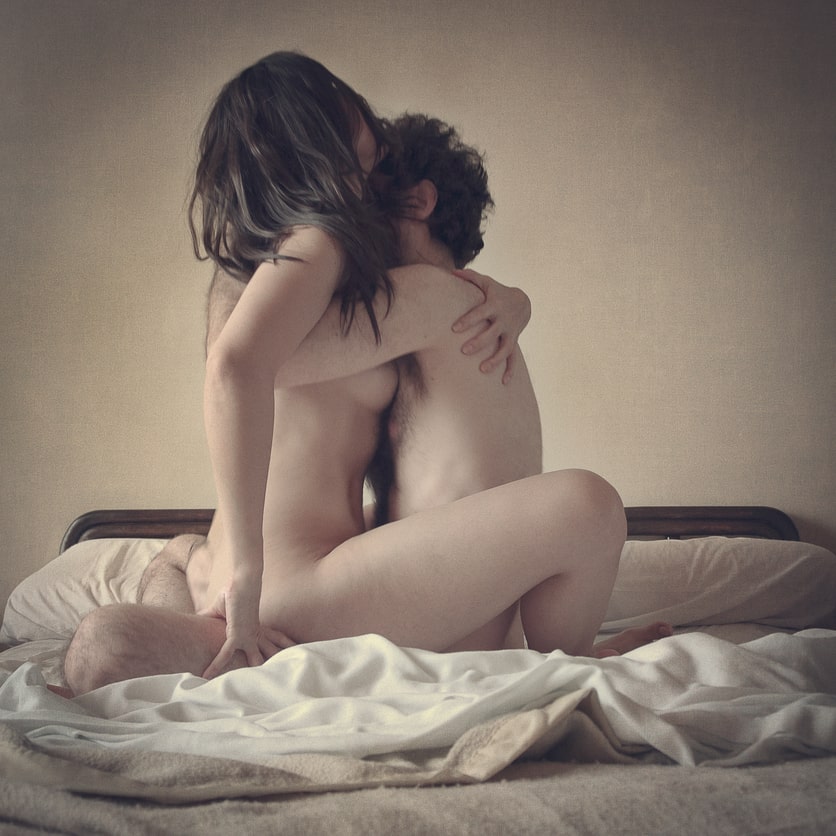 Photograph of a nude couple having sex in bed in the cowgirl sex position. The woman sits on top of her partner with her legs spread, arms reaching above her head to hold on to the wall, while the man, lying below, holds her ass and pushes his erect penis to penetrate her.